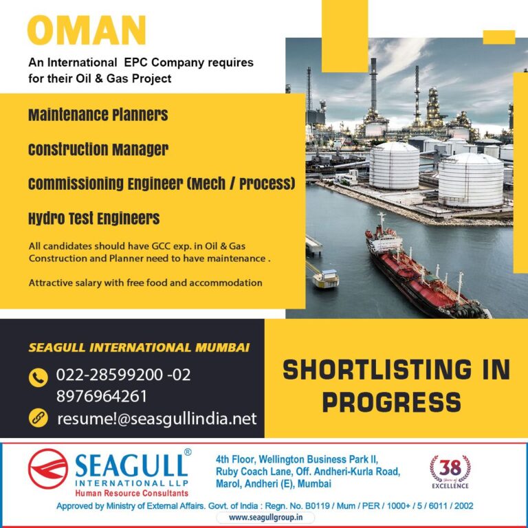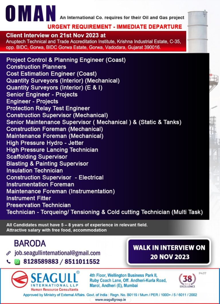 OMANAn International Co. requires for their Oil and Gas projectURGENT REQUIREMENT – IMMEDIATE DEPARTUREClient Interview on 21st Nov 2023 atAnuptech …