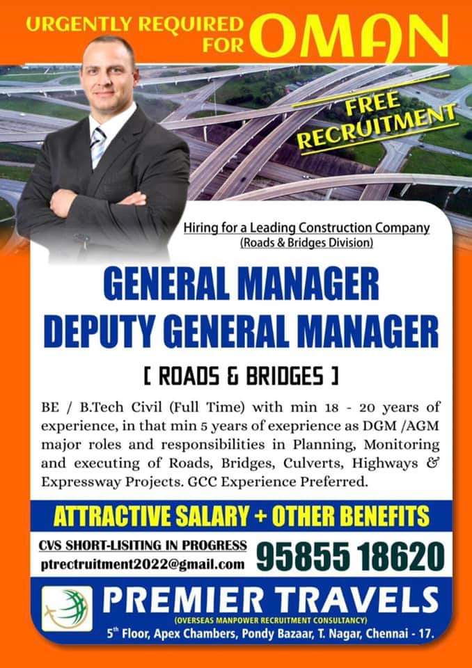 URGENTLY REQUIREDFOR OMANFREE RECRUITMENTHiring for a Leading Construction Company(Roads & Bridges Division)GENERAL MANAGERDEPUTY GENERAL MANAGER[ ROADS & BRIDGES ]BE / …