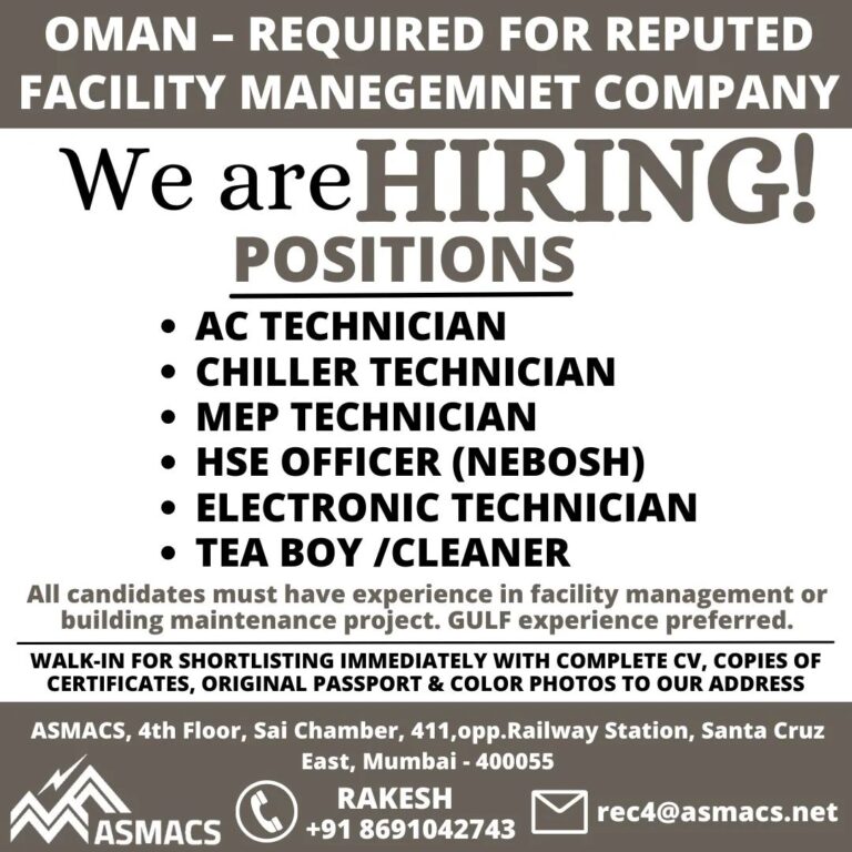 OMAN – REQUIRED FOR REPUTEDFACILITY MANEGEMNET COMPANYWe are HIRING!POSITIONS• AC TECHNICIAN• CHILLER TECHNICIAN• MEP TECHNICIAN• HSE OFFICER (NEBOSH)• ELECTRONIC TECHNICIAN• …