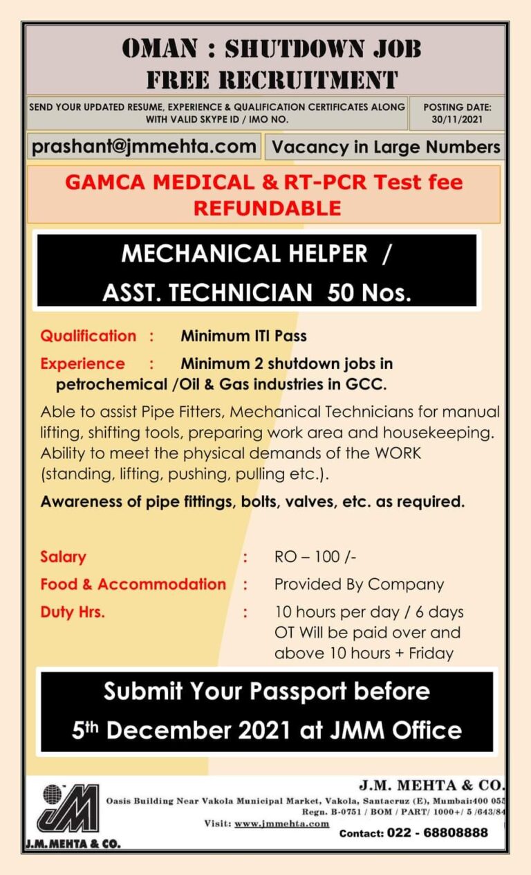 OMAN : SHUTDOWN JOBFREE RECRUITMENTSEND YOUR UPDATED RESUME, EXPERIENCE & QUALIFICATION CERTIFICATES ALONGWITH VALID SKYPE ID / IMO NO.POSTING DATE:30/11/2021prashant@jmmehta.com …