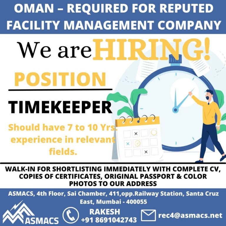 OMAN – REQUIRED FOR REPUTEDFACILITY MANAGEMENT COMPANYTIMEKEEPERShould have 7 to 10 Yrsexperience in relevanfields.WALK-IN FOR SHORTLISTING IMMEDIATELY WITH COMPLETE CV,COPIES …