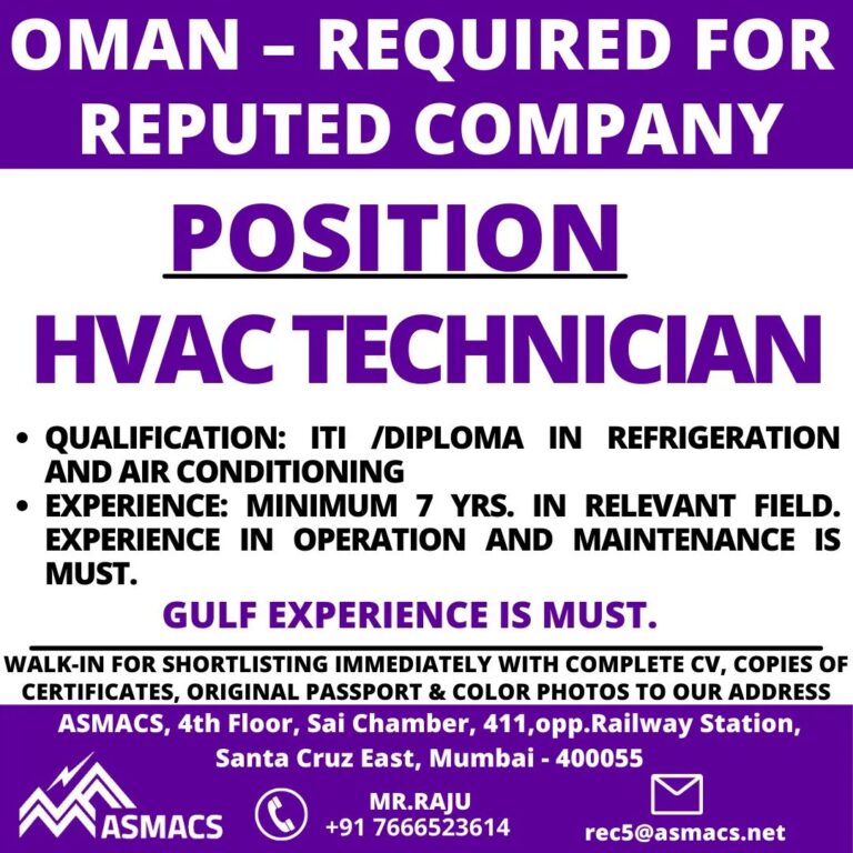 OMAN – REQUIRED FORREPUTED COMPANYPOSITIONHVAC TECHNICIAN• QUALIFICATION: ITI /DIPLOMA IN REFRIGERATIONAND AIR CONDITIONING• EXPERIENCE: MINIMUM 7 YRS. IN RELEVANT FIELD.EXPERIENCE …