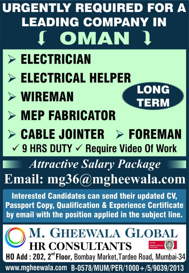 URGENTLY REQUIRED FOR ALEADING COMPANY IN OMAN> ELECTRICIAN > ELECTRICAL HELPERLONG > WIREMANTERM ► MEP FABRICATOR→ CABLE JOINTER→ FOREMAN ✓ …