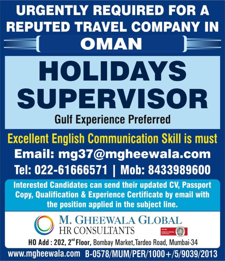 URGENTLY REQUIRED FOR AREPUTED TRAVEL COMPANY INOMANHOLIDAYSSUPERVISORGulf Experience PreferredExcellent English Communication Skill is mustEmail: mg37@mgheewala.comTel: 022-61666571 Mob: 8433989600Interested candidates can …