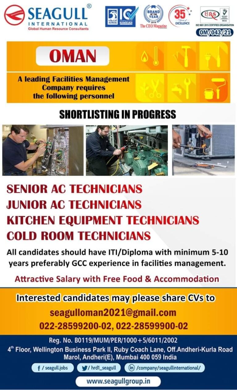 OMANA leading Facilities ManagementCompany requiresthe following personnelOM/043/21SENIOR AC TECHNICIANSJUNIOR AC TECHNICIANSKITCHEN EQUIPMENT TECHNICIANSCOLD ROOM TECHNICIANSAll candidates should have ITI/Diploma with …