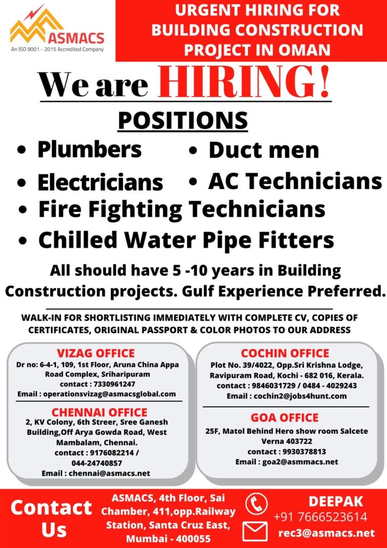 URGENT HIRING FOR MASMACSBUILDING CONSTRUCTIONPROJECT IN OMAN We are HIRING!POSITIONS • Plumbers • Duct men • Electricians • AC Technicians …