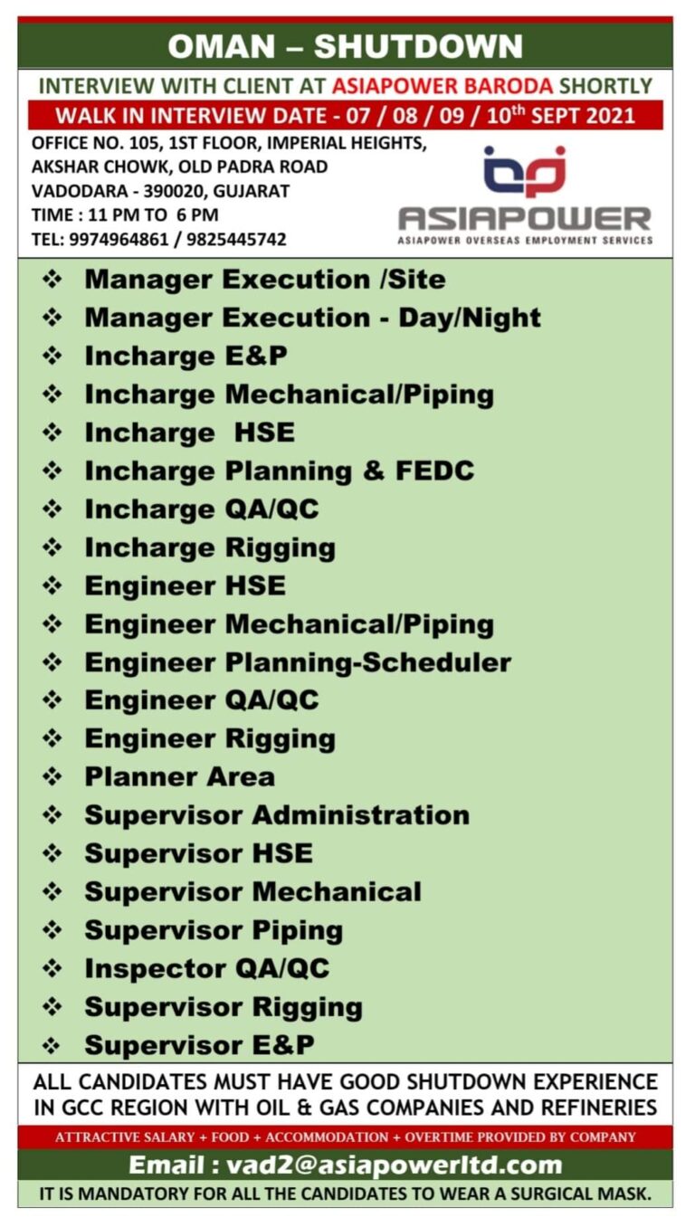 OMAN – SHUTDOWNINTERVIEW WITH CLIENT AT ASIAPOWER BARODA SHORTLYWALK IN INTERVIEW DATE – 07 / 08 / 09 / 10th …