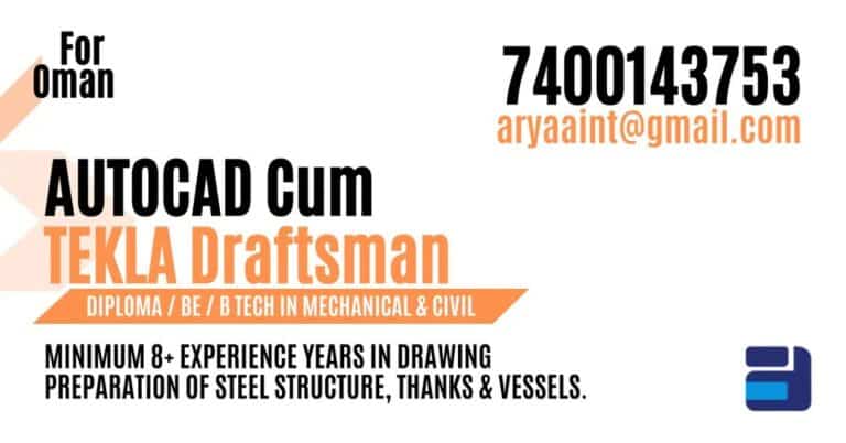 For …Oman7400143753aryaaint@gmail.comAUTOCAD CumTEKLA DraftsmanDIPLOMA / BE / B TECH IN MECHANICAL & CIVILMINIMUM 8+ EXPERIENCE YEARS IN DRAWINGPREPARATION OF STEEL …