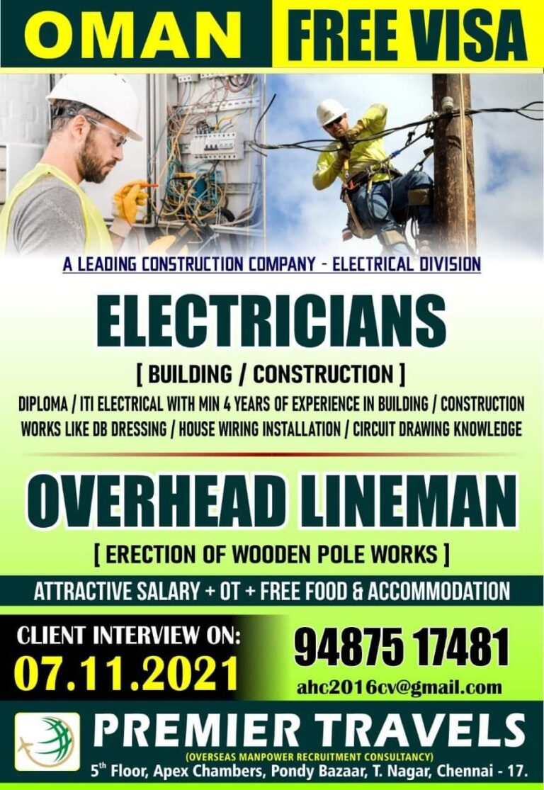 OMAN FREE VISAA LEADING CONSTRUCTION COMPANY – ELECTRICAL DIVISIONELECTRICIANS[ BUILDING / CONSTRUCTION ]DIPLOMA / ITI ELECTRICAL WITH MIN 4 YEARS …