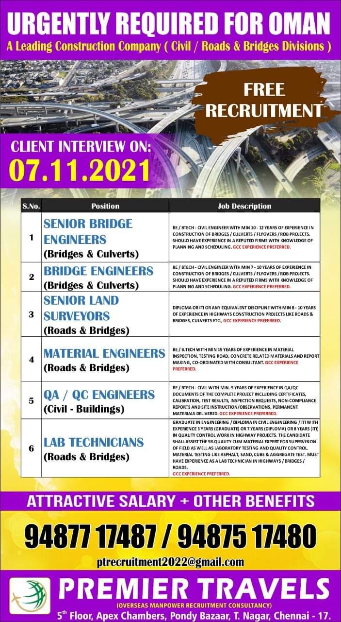 URGENTLY REQUIRED FOR OMANA Leading Construction Company ( Civil / Roads & Bridges Divisions )FREERECRUITMENTCLIENT INTERVIEW ON:07.11.2021Job DescriptionBE/BTECH – CIVIL …