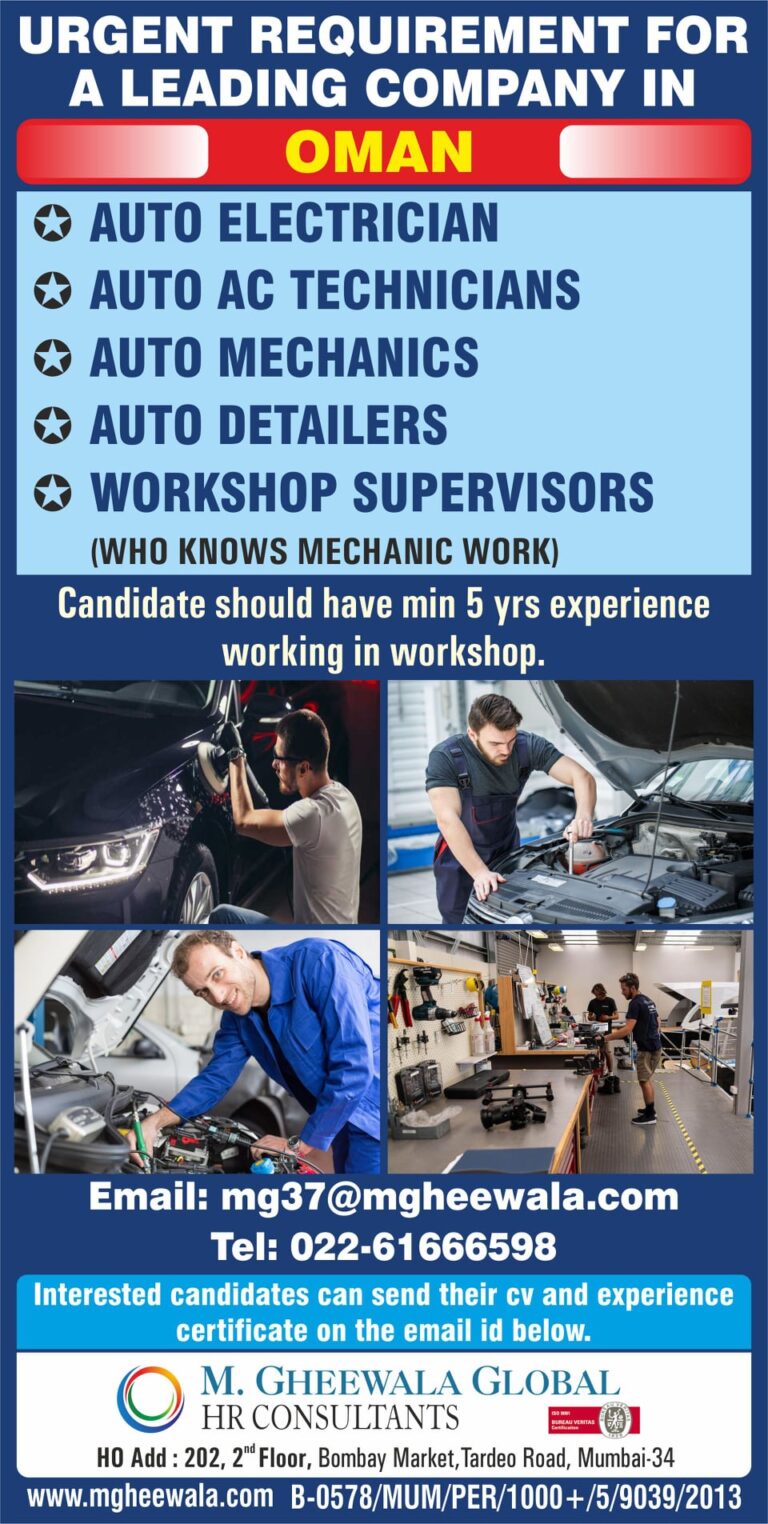 URGENT REQUIREMENT FORA LEADING COMPANY INOMANAUTO ELECTRICIANAUTO AC TECHNICIANSAUTO MECHANICSAUTO DETAILERSWORKSHOP SUPERVISORS(WHO KNOWS MECHANIC WORK)Candidate should have min 5 yrs …