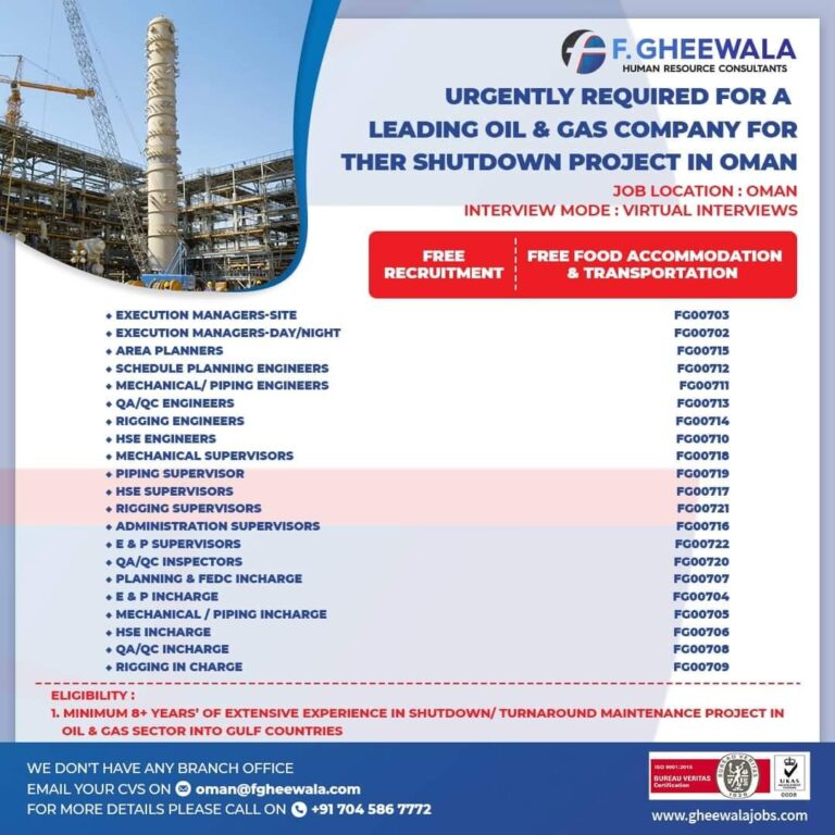 F. GHEEWALAHUMAN RESOURCE CONSULTANTSURGENTLY REQUIRED FOR ALEADING OIL & GAS COMPANY FORTHER SHUTDOWN PROJECT IN OMANJOB LOCATION: OMANINTERVIEW MODE: VIRTUAL …