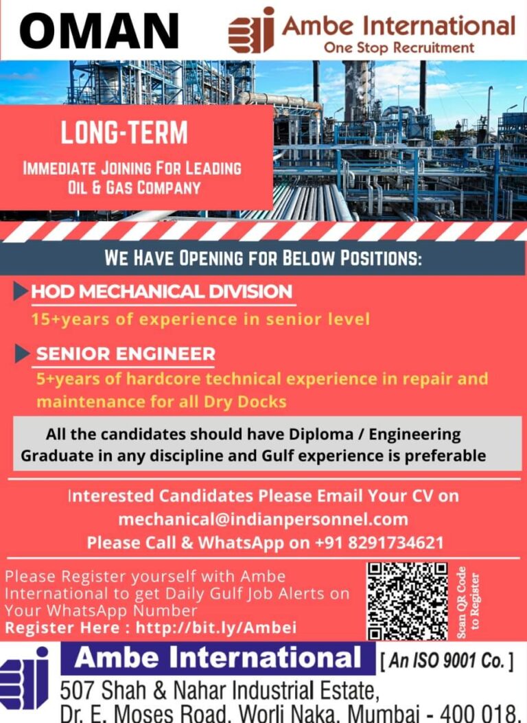 LONG-TERMIMMEDIATE JOINING FOR LEADINGOIL & GAS COMPANYWE HAVE OPENING FOR BELOW POSITIONS:HOD MECHANICAL DIVISION15+years of experience in senior levelSENIOR ENGINEER5+years …