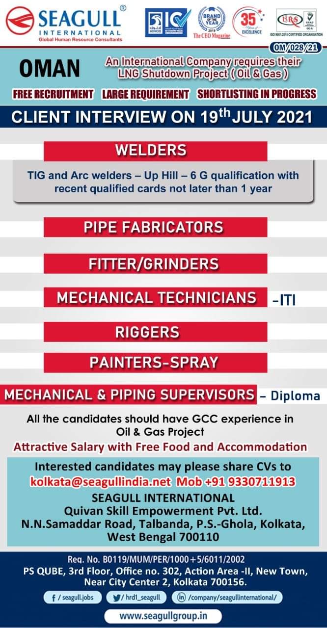 OMAN An International Company requires for theirPetro-Chemical Shutdown Project (3 Months)WALK IN INTERVIEW ON19th & 20th JULY 2021FREE RECRUITMENT LARGE …
