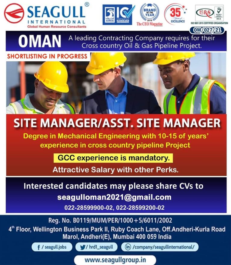 OMAN A leading Contracting Company requires for theirCross country Oil & Gas Pipeline Project.SHORTLISTING IN PROGRESSSITE MANAGER/ASST. SITE MANAGERDegree in …