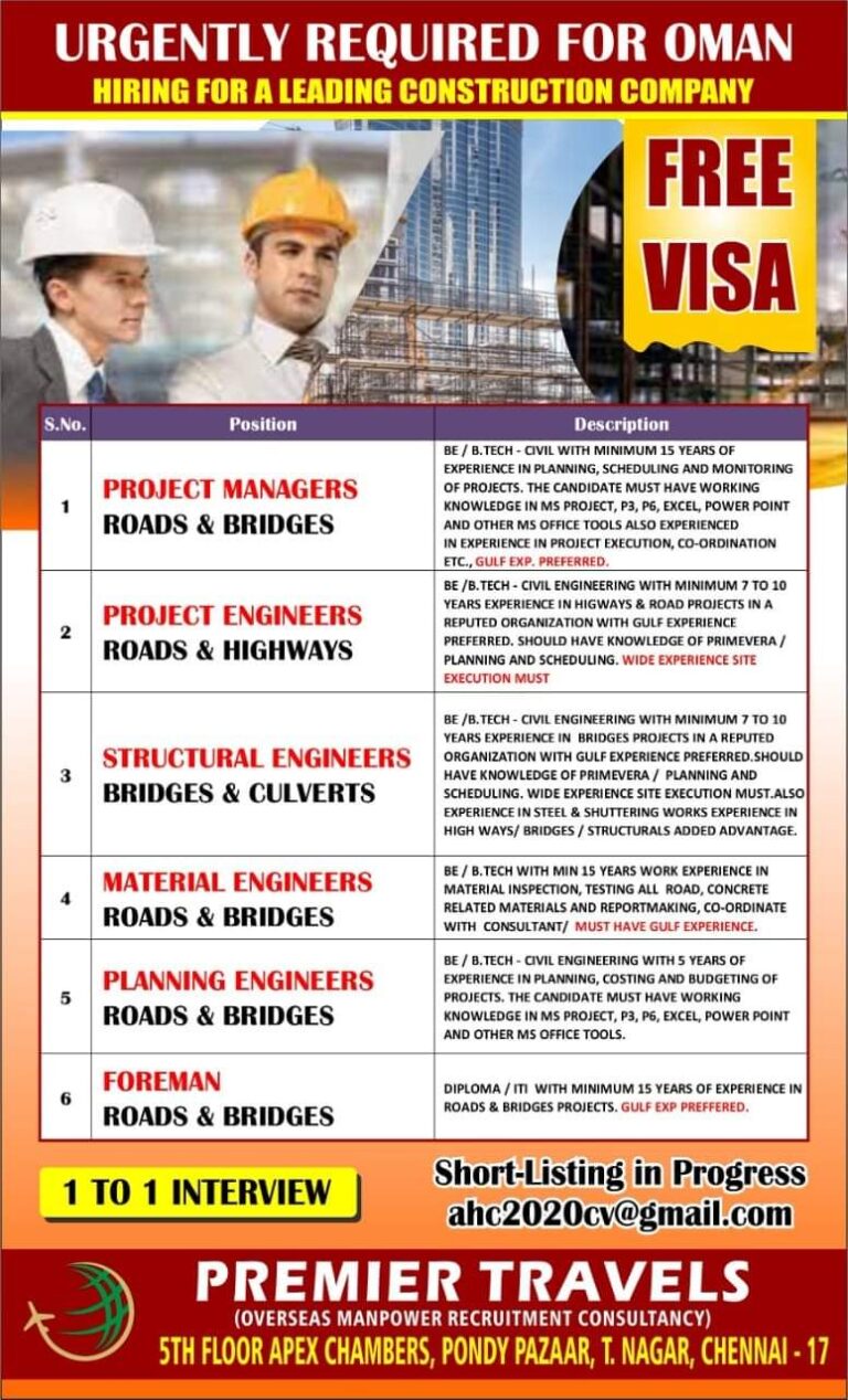 URGENTLY REQUIRED FOR OMANHIRING FOR A LEADING CONSTRUCTION COMPANYPROJECT MANAGERSBE / B.TECH – CIVIL WITH MINIMUM 15 YEARS OFEXPERIENCE IN …