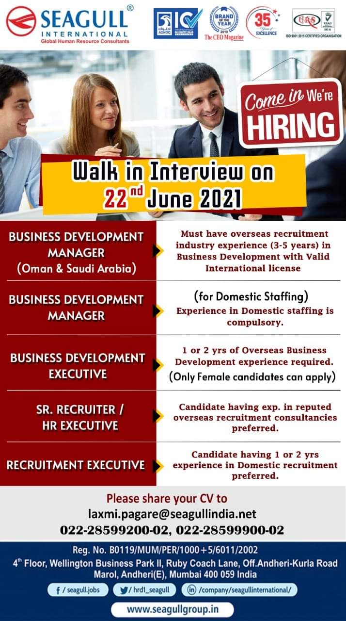 HIRINGWalk in Interview on22 “June 2021Must have overseas recruitmentBUSINESS DEVELOPMENTMANAGER(Oman & Saudi Arabia)industry experience (3-5 years) inBusiness Development with ValidInternational …