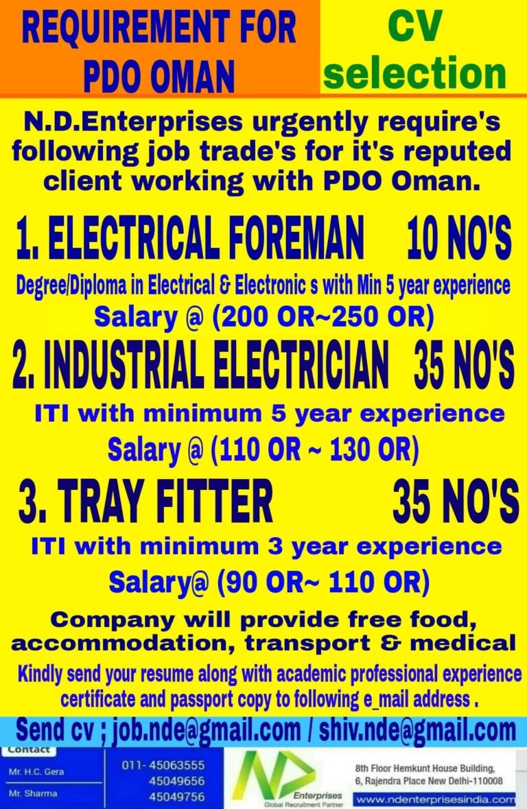 REQUIREMENT FOR CVPDO OMAN selectionN.D.Enterprises urgently require’sfollowing job trade’s for it’s reputedclient working with PDO Oman. ELECTRICAL FOREMAN 10 NO’SDegree/Diploma …