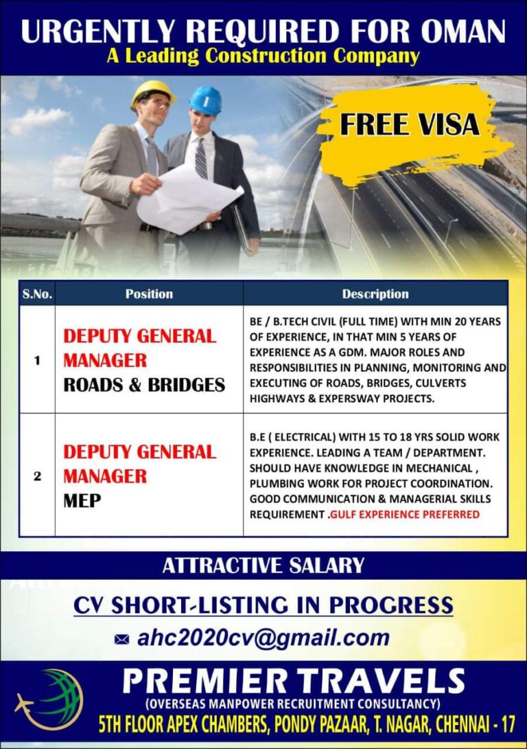 URGENTLY REQUIRED FOR OMANA Leading Construction CompanyFREE VISADEPUTY GENERALBE / B.TECH CIVIL (FULL TIME) WITH MIN 20 YEARSOF EXPERIENCE, IN …
