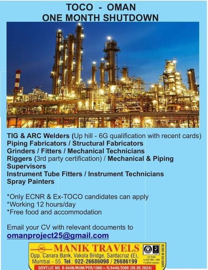 TOCO OMANONE MONTH SHUTDOWNTIG & ARC Welders (Up hill – 6G qualification with recent cards)Piping Fabricators / Structural FabricatorsGrinders / …