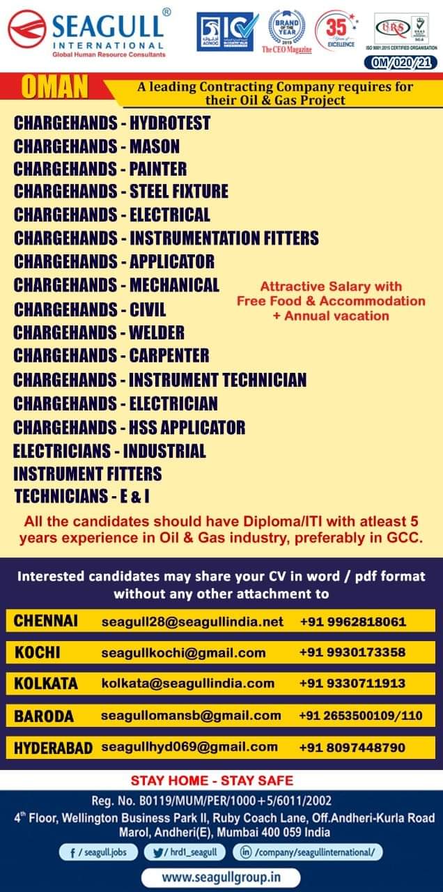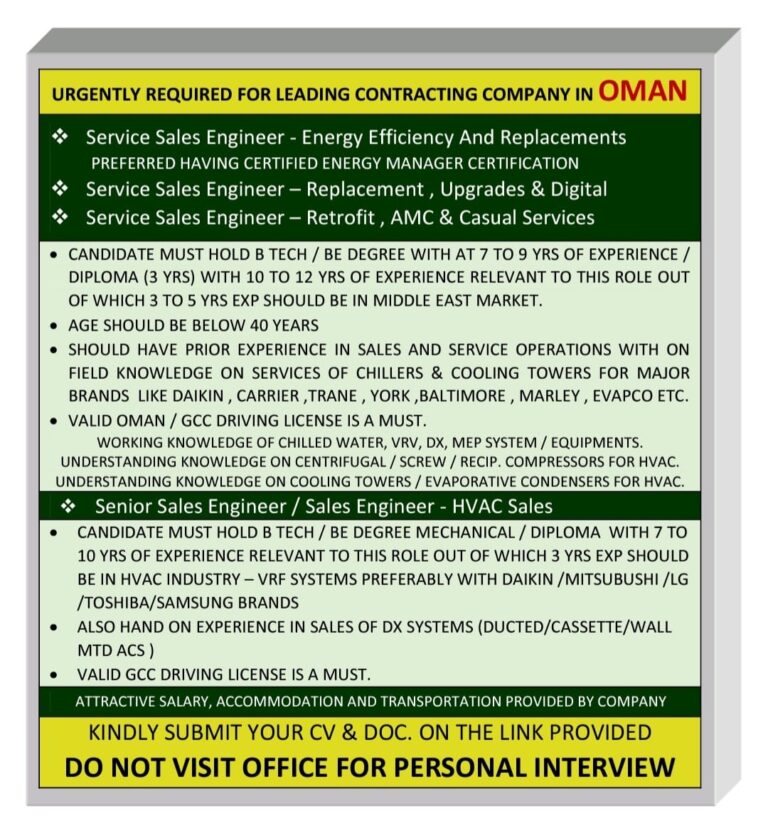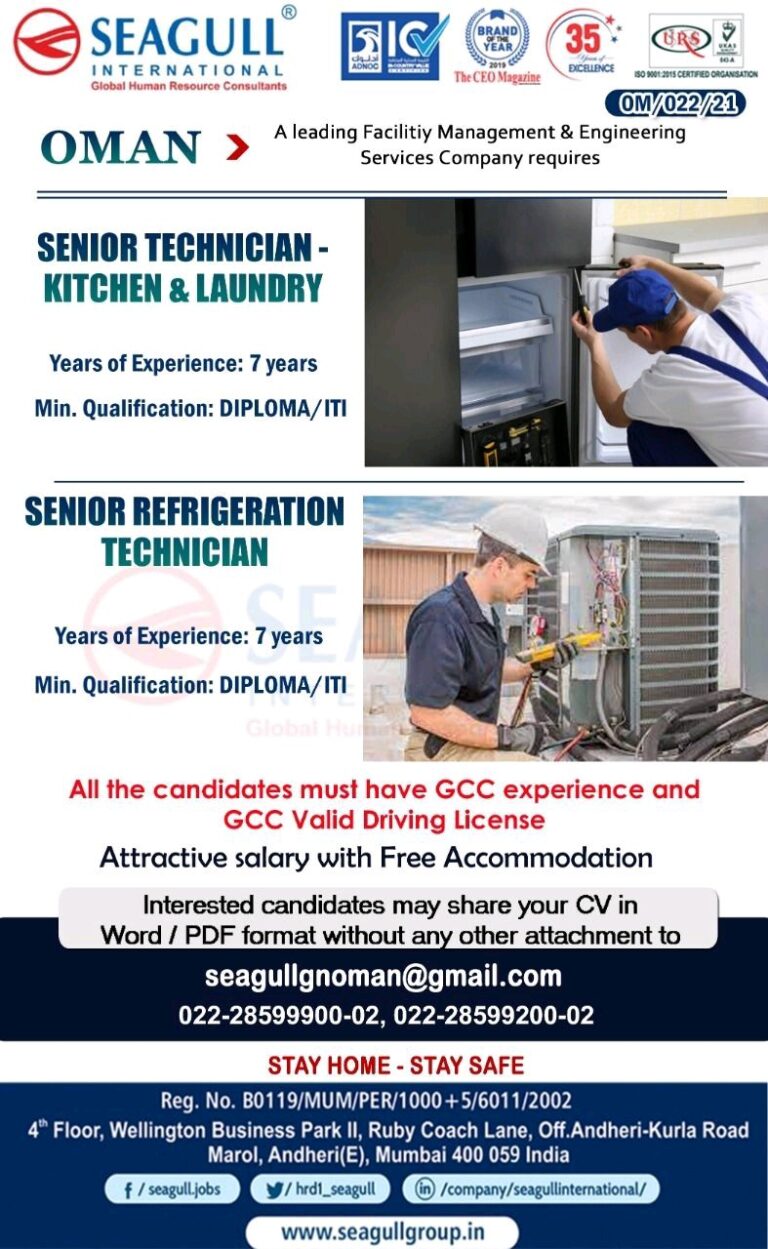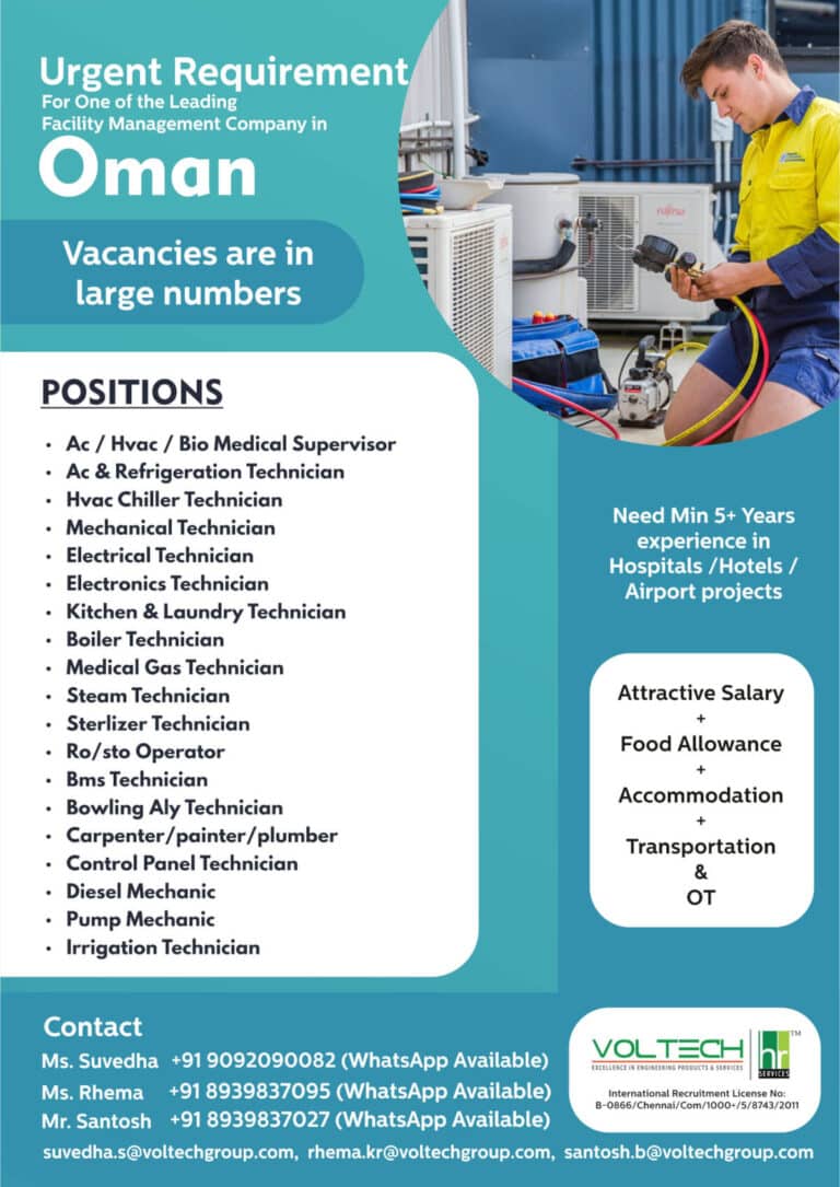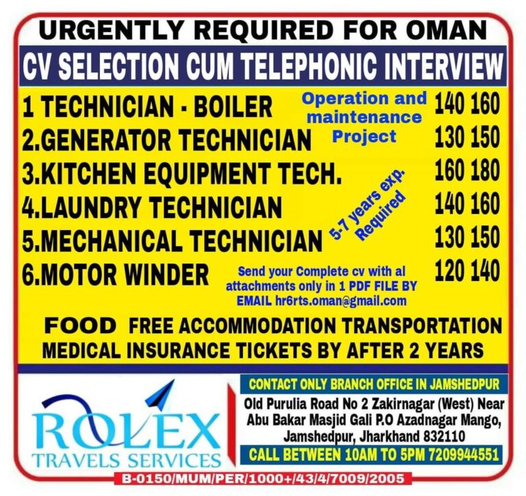 URGENTLY REQUIRED FOR OMANCV SELECTION CUM TELEPHONIC INTERVIEWOperation and1 TECHNICIAN • BOILERmaintenance2.GENERATOR TECHNICIANProject31KlTCHEN EQUIPMENT TECH.4.LAUNDRY TECHNICIAN5.MECHANlCAL TECHNICIAN %61MOTOR WINDERSend your …