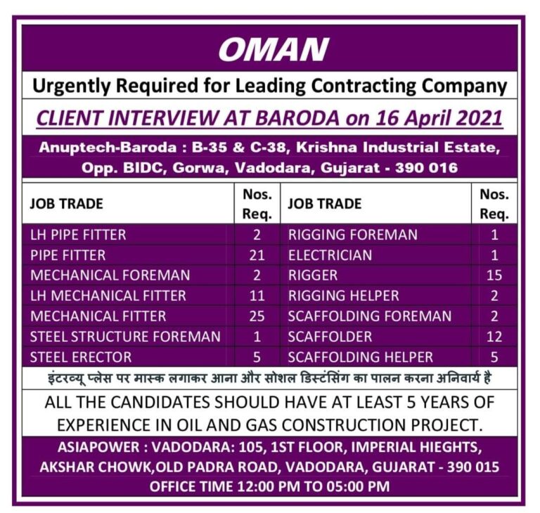 OMANUrgently Required for Leading Contracting CompanyCLIENT INTERVIEW AT BARODA on 16 April 2021Anuptech-Baroda : B-35 & C-38, Krishna Industrial Estate,Opp. …