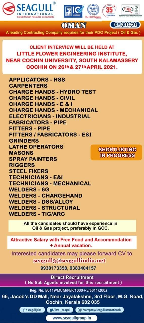OMANA leading Contracting Company requires for their PDO Project (Oil & Gas)CLIENT INTERVIEW WILL BE HELD ATLITTLE FLOWER ENGINEERING INSTITUTE,NEAR …
