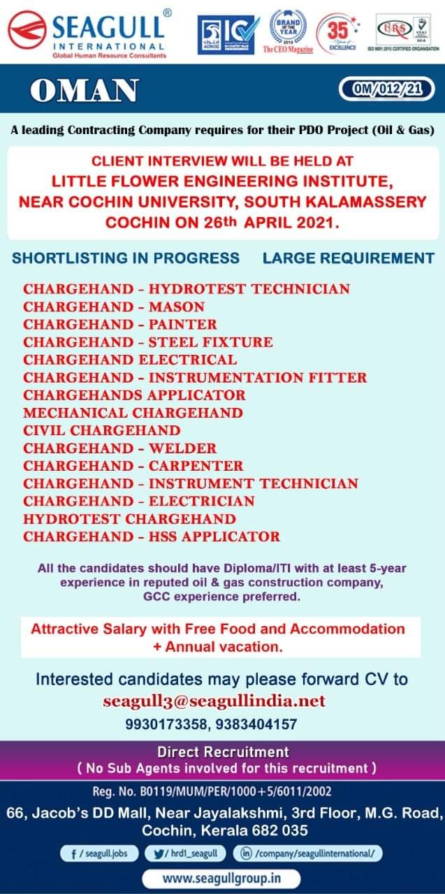 OMANOM/011/21A leading Contracting Company requires for their PDO Project ( Oil & Gas )CLIENT INTERVIEW WILL BE HELD ATLITTLE FLOWER …