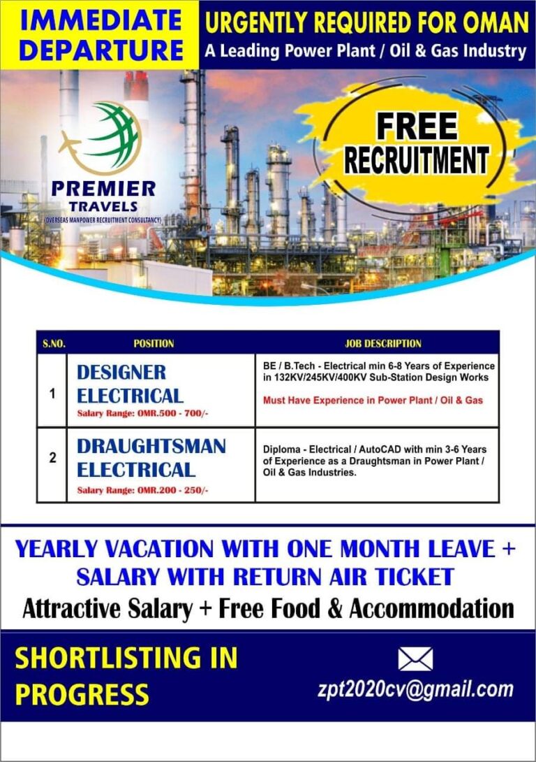 URGENTLY REQUIRED FOR OMANA Leading Power Plant / Oil & Gas IndustryFREERECRUITMENTs.N0.POSITIONDESIGNERI ELECTRICALSalary Range: OMR.500 – 700/-DRAUGHTSMANELECTRICALsalary Ranøe: OMR.200 – …