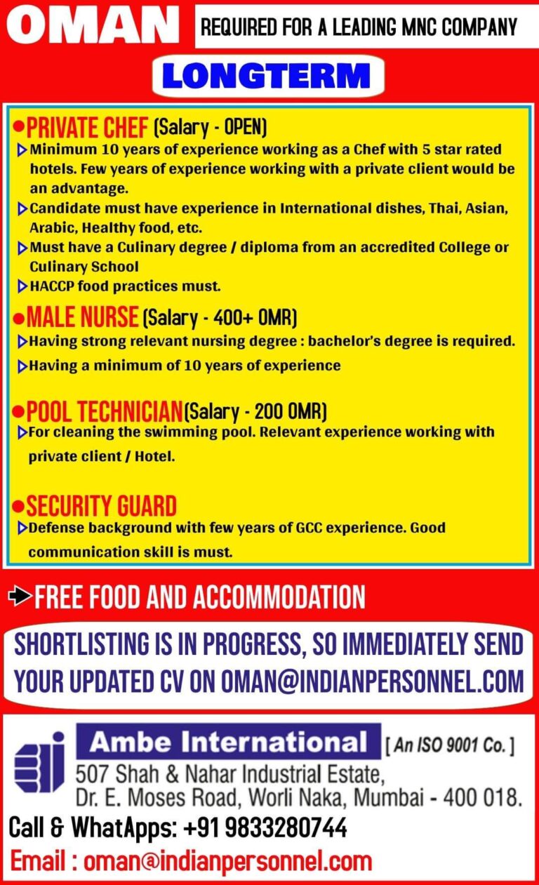 OMANREQUIRED FOR A LEADING MNC COMPANYLONGTERM‘PRIVATE CHEF(Salary – OPEN)Minimum 10 years of experience working as a Chef with 5 star …