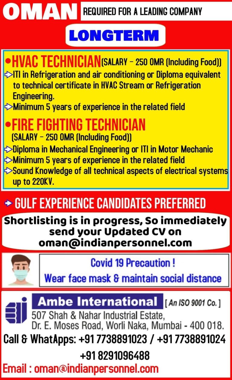 OMANREQUIRED FOR A LEADING COMPANYLONGTERM‘HVAC TECHNICIAN(SALARY – 250 OMR (Including Food))c>lTl in Refrigeration and air conditioning or Diploma equivalentto technical …
