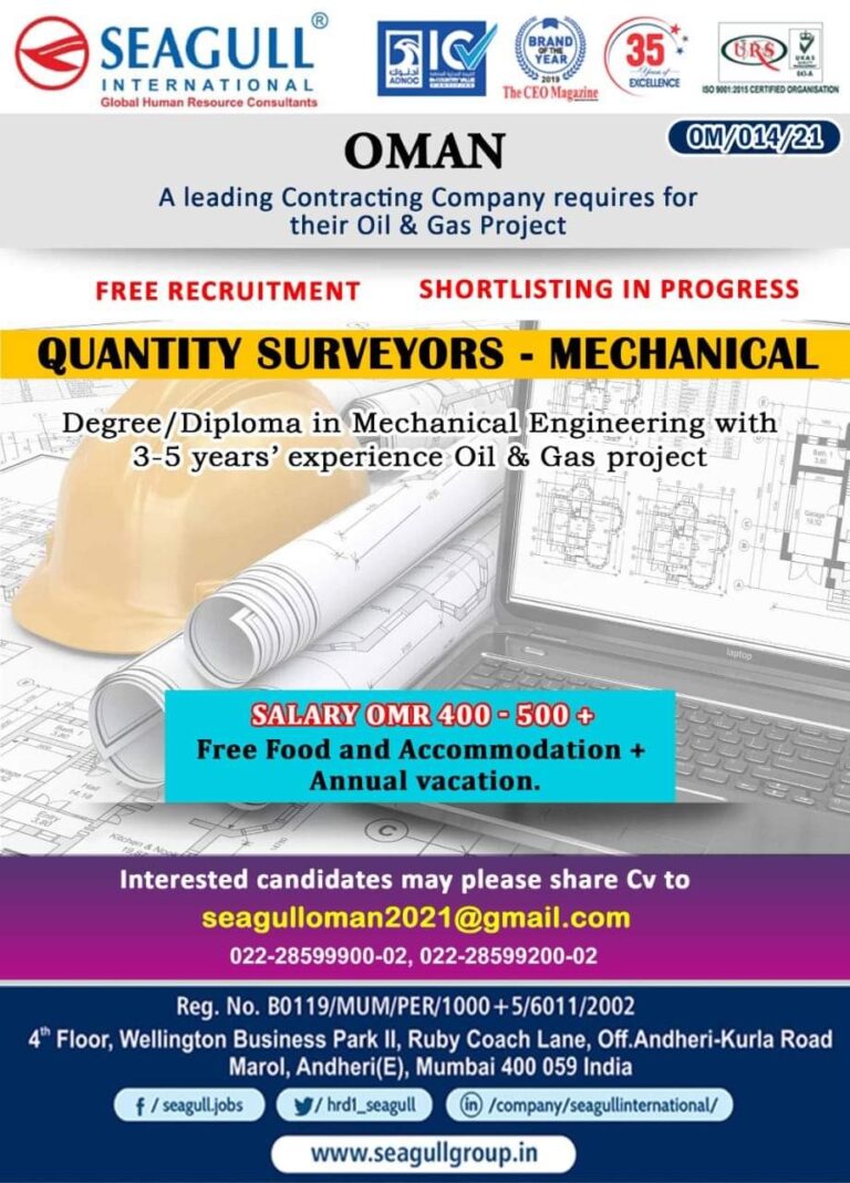 The CEOGlobal Human Resource ConsultantsOMAN0M/Æ/21A leading Contracting Company requires fortheir Oil & Gas ProjectSHORTLISTING IN PROGRESSFREE RECRUITMENTQUANTITY SURVEYORS – MECHANICALDegree/ …