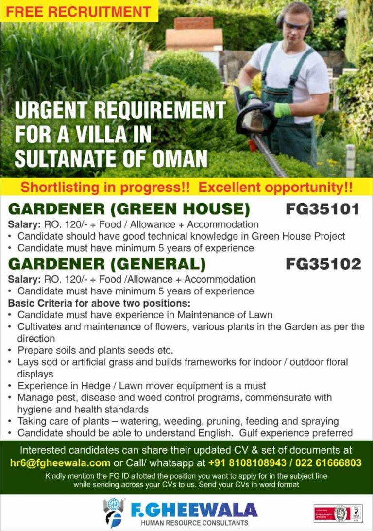 FREE RECRUITMENTURGENT REQUIREMENTFOR A VILLA INSULTANATEShortlisting in progress!! Excellent opportunity!!GARDENER (GREEN HOUSE)FG35101Salary: RO. 120/- + Food / Allowance + Accommodation• …