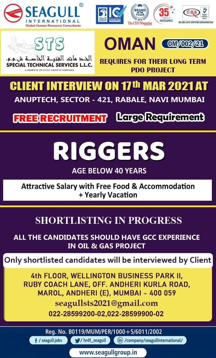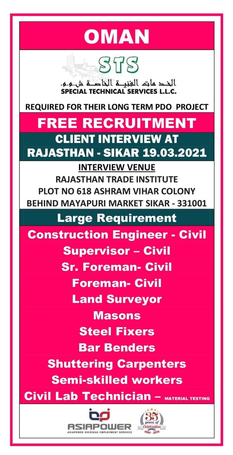 OMAN SPECIAL TECHNICAL SERVICES L.L.C.REQUIRED FOR THEIR LONG TERM PDO PROJECTFREE RECRUITMENTCLIENT INTERVIEW ATRAJASTHAN – SIKAR 19-03.2021INTERVIEW VENUERAJASTHAN TRADE INSTITUTEPLOT …
