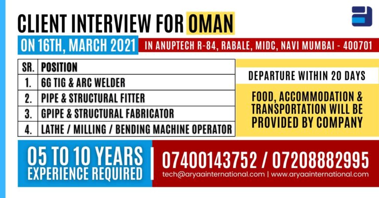 CLIENT INTERVIEW FOR OMANON 16TH, MARCH 2021 IN ANUPTECH R-84, RABALE, MIDC, MUMBAI – 400701SR. POSITIONl. WELDER FITTER FABRICATORDEPARTURE WITHIN …