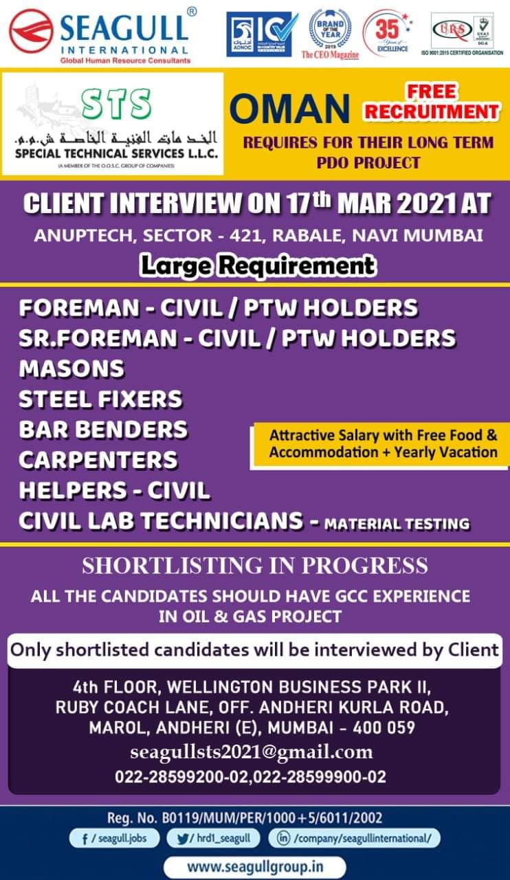 OMAN REQUIRES FOR THEIR LONG TERMPDO PROJECTCLIENT INTERVIEW ON 17th MAR 2021 ATANUPTECH, SECTOR – 421, RABALE, NAVI MUMBAILarge RequirementFREE …