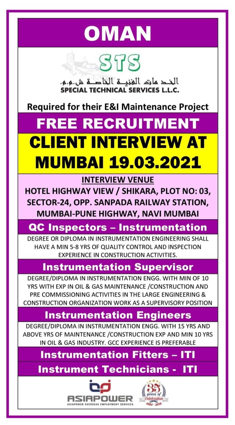 OMAN SPECIAL TECHNICAL SERVICES L.L.C.Required for their E&I Maintenance ProjectFREE RECRUITMENTCLIENT INTERVIEW ATMUMBAI 19.03.2021INTERVIEW VENUEHOTEL HIGHWAY VIEW / SHIKARA, PLOT …