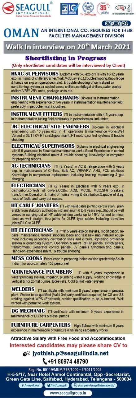 OMANAN INTERNATIONAL CO. REQUIRES FOR THEIRFACILITIES MANAGEMENT DIVISIONWalk In interview on 20th March 2021Shortlisting in Progress(Only shortlisted candidates will be …