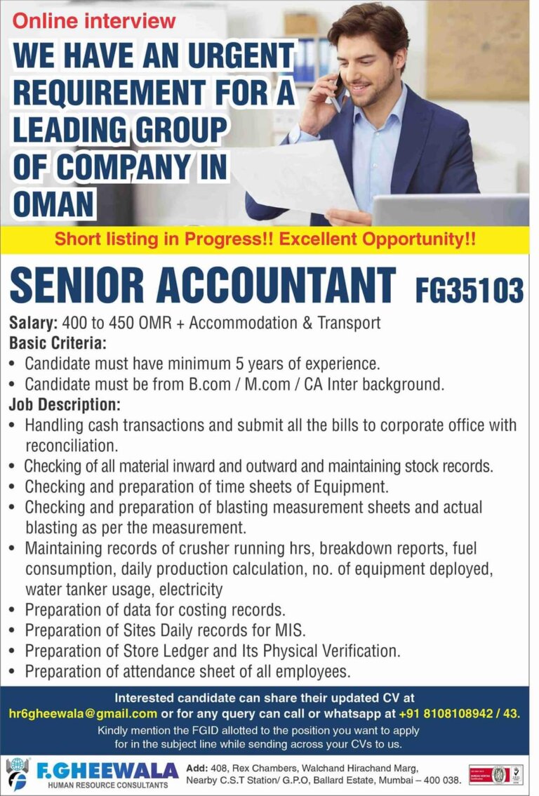 WE HAVE AN URGENT”REQUIREMENT FOR ALEADINGKGROUPOF COMPANY INShort listing in Progress!! Excellent Opportunity!!SENIOR ACCOUNTANTSalary: 400 to 450 OMR + Accommodation …