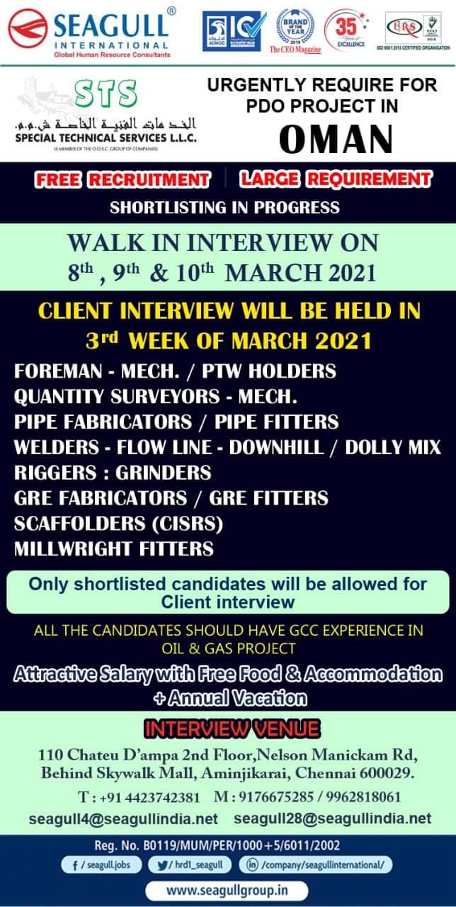 SPECIAL TECHNICAL SERVICES L.L.c.FREE RECRUITMENTURGENTLY REQUIRE FORPDO PROJECT IN OMANSHORTLISTING IN PROGRESSWALK IN INTERVIEW ON8th 9th & 10th MARCH 2021CLIENT …