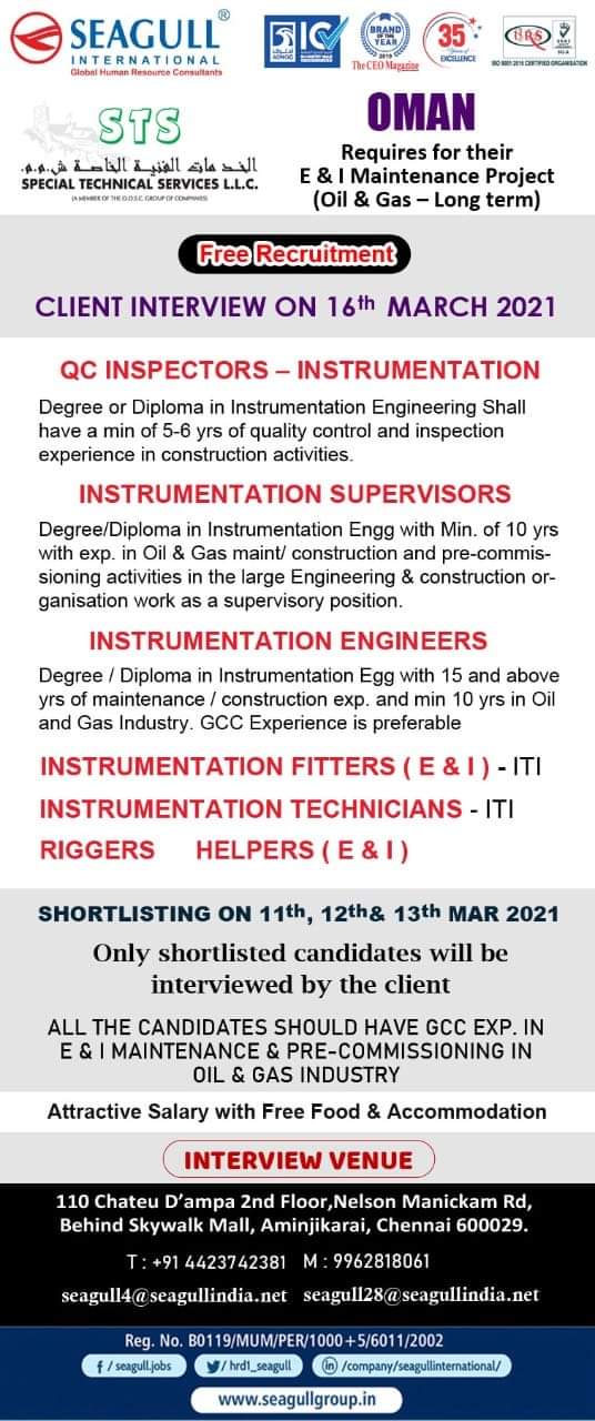 SPECIAL TECHNICAL SERVICES L.L.c.OMANRequires for theirE & I Maintenance Project(Oil & Gas — Long term)Free RecruitmentCLIENT INTERVIEW ON 16th MARCH …