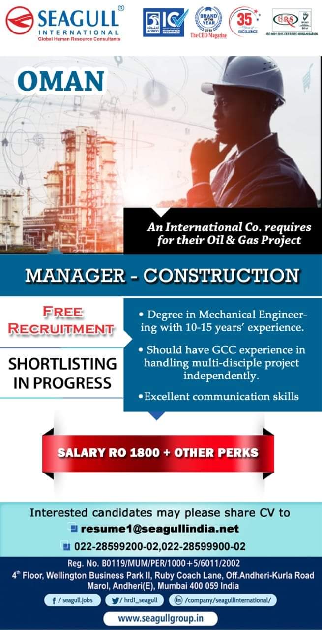 OMAN FREE RECRUITMENTSHORTLISTINGIN PROGRESSAn International Co. requiresfor their Oil & Gas Project CONSTRUCTION• Degree in Mechanical Engineer-ing with 10-15 years’ …