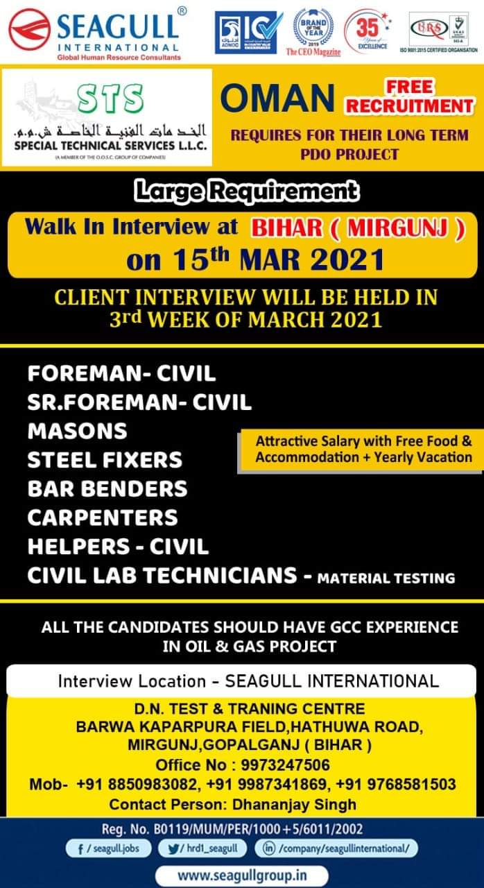 FREE OMAN RECRUITMENTREQUIRES FOR THEIR LONG TERMSPECIAL TECHNICAL SERVICES L.L.c.PDO PROJECTLarge RequirementWalk In Interview atBIHAR ( MIRGUNJ )on 15th MAR …