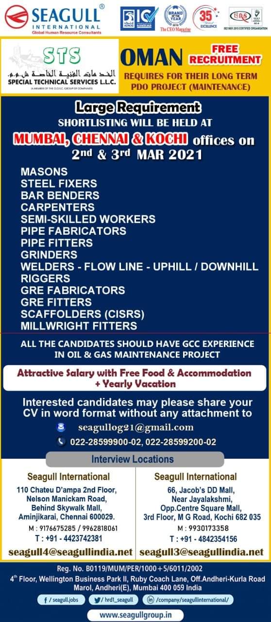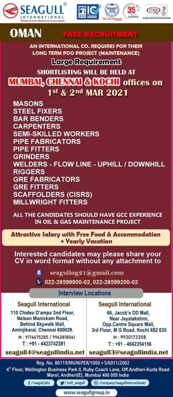 AN INTERNATIONAL CO. REQUIRES FOR THEIRLONG TERM PDO PROJECT (MAINTENANCE)Large RequirementSHORTLISTING WILL BE HELD AToffices on& 2nd MAR 2021MASONSSTEEL FIXERSBAR …