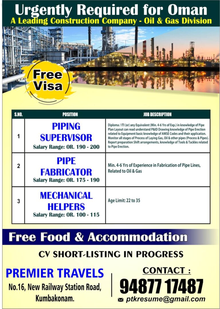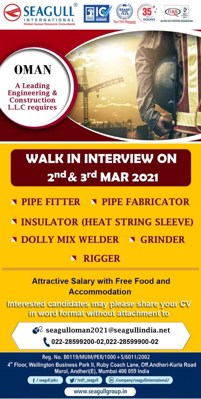 OMAN A Leading Engineering & ConstructionL.LC requiresWALK IN INTERVIEW ON2nd& 3rd MAR 2021PIPE FITTER PIPE FABRICATORINSULATOR (HEAT STRING SLEEVE)DOLLY MIX …