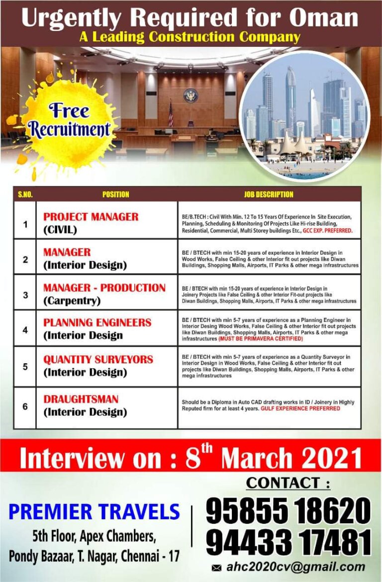 Urgently Required for OmanA Leading Construction CompanyPROJECT MANAGER(CIVIL)MANAGER(Interior Design)JOB DESCRIPTIONMANAGER – PRODUCTION(Carpentry)PUNNING ENGINEERS(Interior DesignQUANTITY SURVEYORS(Interior Design)DRAUGHTSMAN(Interior Design)Interview onPREMIER TRAVELS5th Floor, …