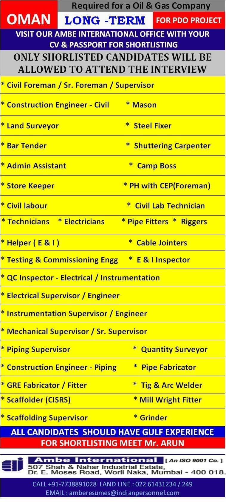 Gas CompanyOMAN LONG -TERMFOR PDO PROJECTVISIT OUR AMBE INTERNATIONAL OFFICE WITH YOURCV & PASSPORT FOR SHORTLISTINGONLY SHORLISTED CANDIDATES WILL BEALLOWED …