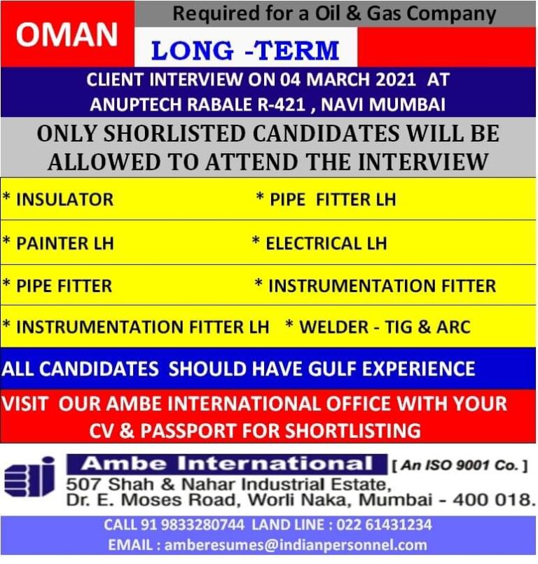 OMAN LONG -TERMCLIENT INTERVIEW ON 04 MARCH 2021 ATANUPTECH RABALE R-421 , NAVI MUMBAIONLY SHORLISTED CANDIDATES WILL BEALLOWED TO ATTEND …