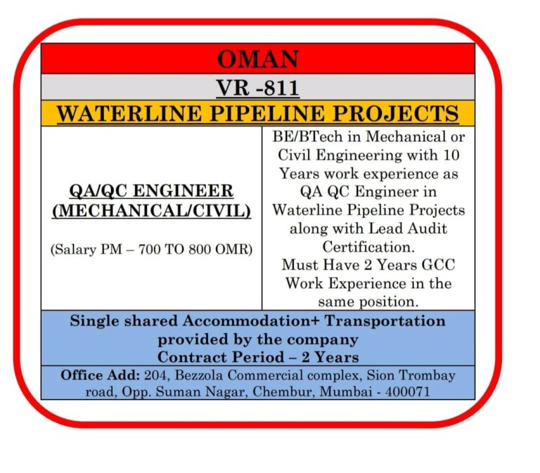 OMAN VR -811WATERLINE PIPELINE PROJECTSQA/QC ENGINEER(MECHANICAL/CIVIL)(Salary PM – 700 TO 800 OMR)BE/BTech in Mechanical orCivil Engineering with 10Years work experience …