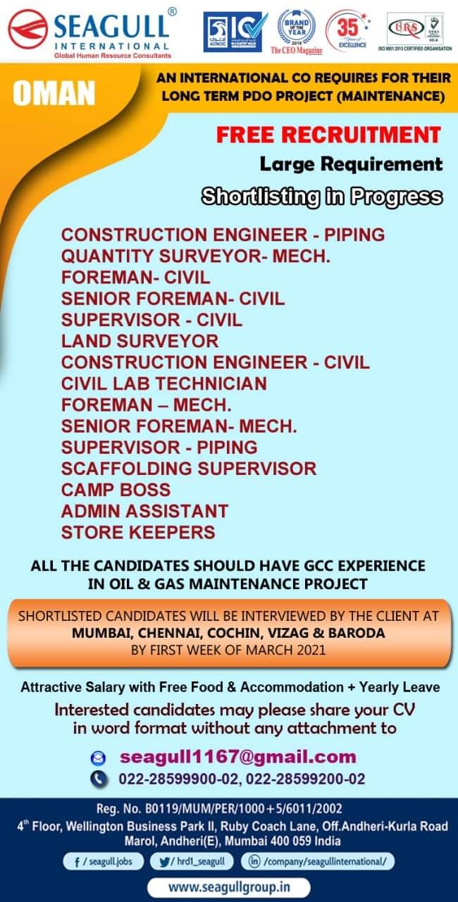0MAN CEOAN INTERNATIONAL CO REQUIRES FOR THEIRLONG TERM PDO PROJECT (MAINTENANCE)FREE RECRUITMENTLarge RequirementShortlisting in ProgressCONSTRUCTION ENGINEER – PIPINGQUANTITY SURVEYOR- MECH.FOREMAN- …